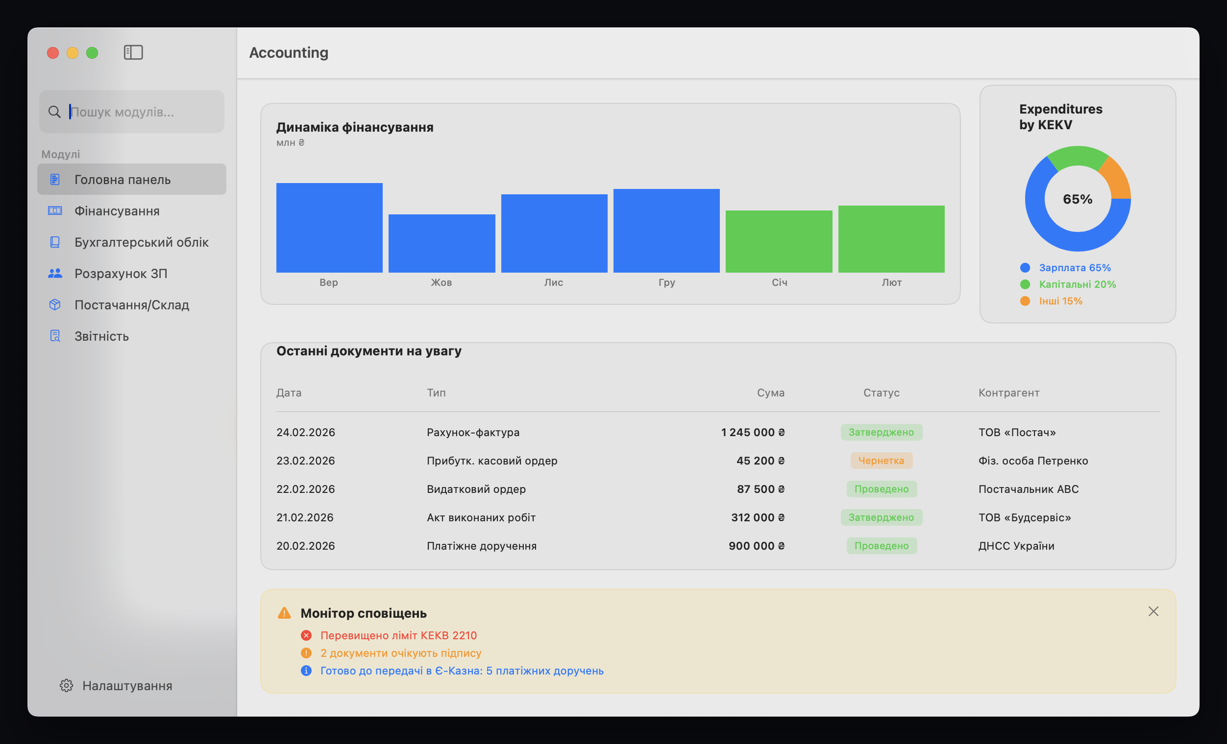 - Повна відповідність Бюджетному кодексу, П(С)БО, податковому та трудовому законодавству України