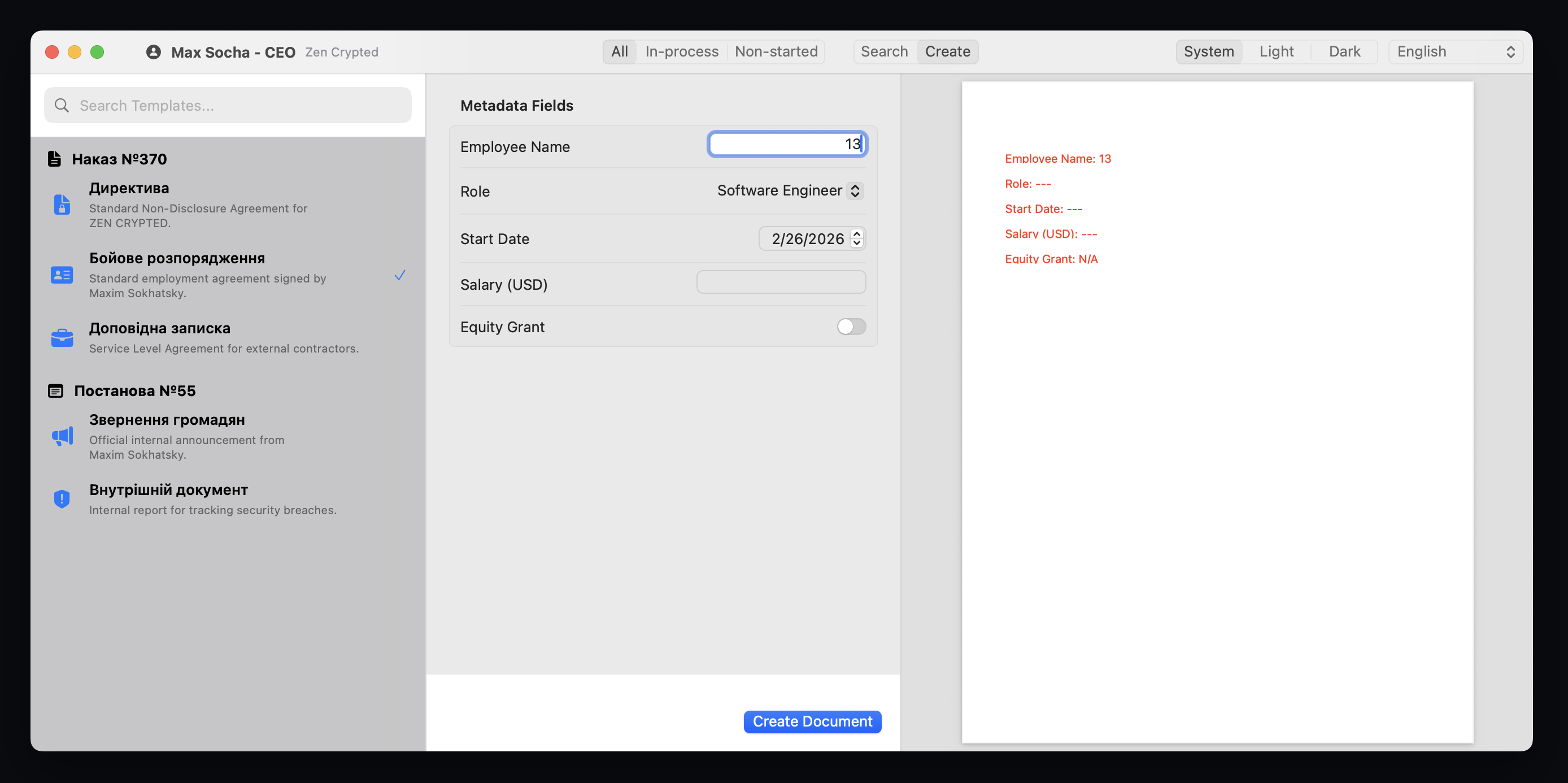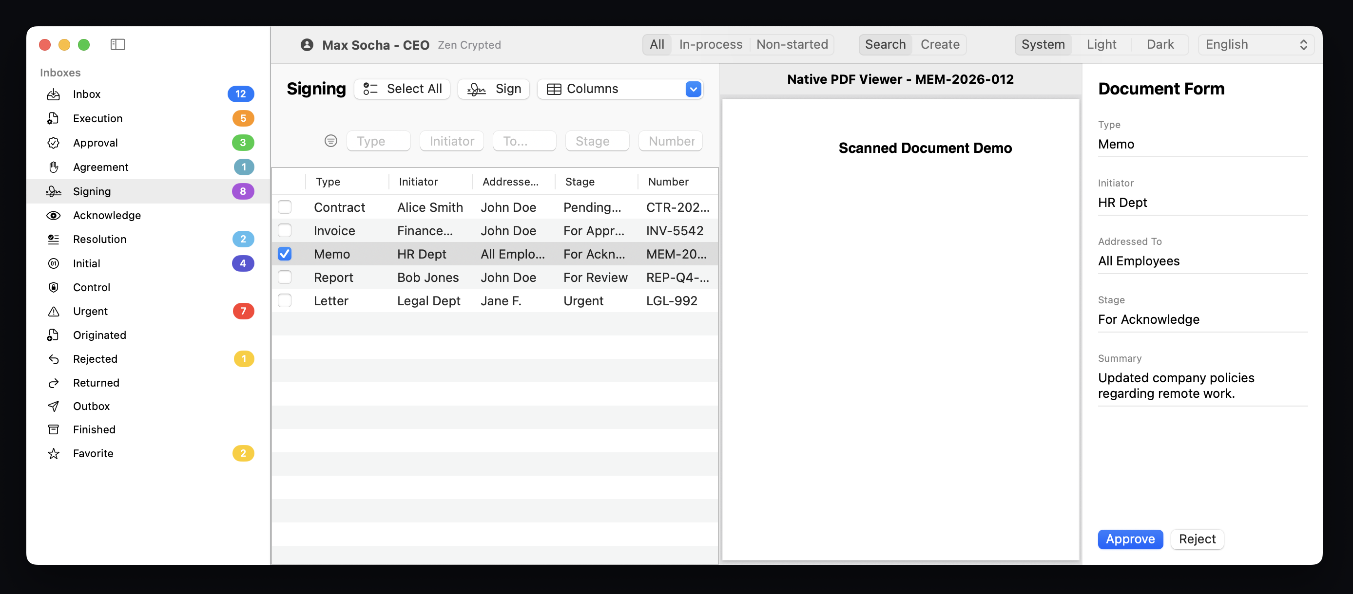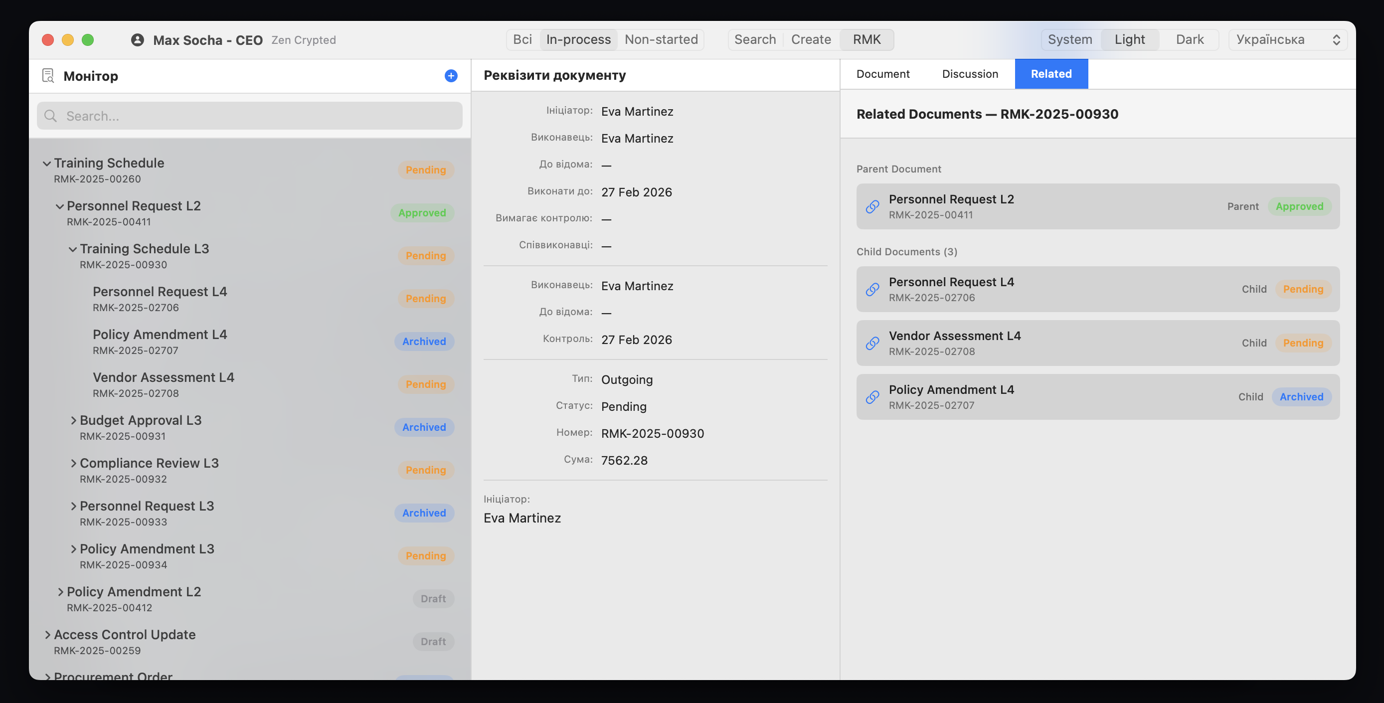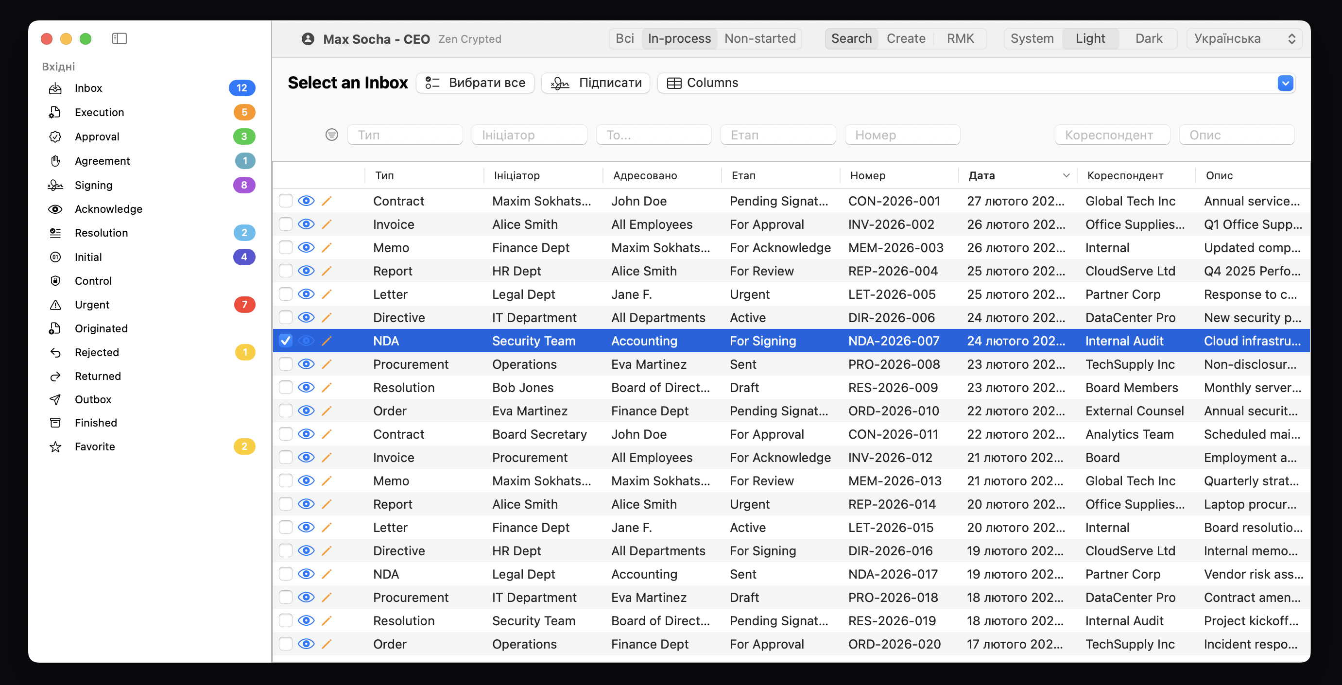Підтримка життєвого циклу документів: реєстрація, редагування, погодження, підписання, розсилка, архівування.